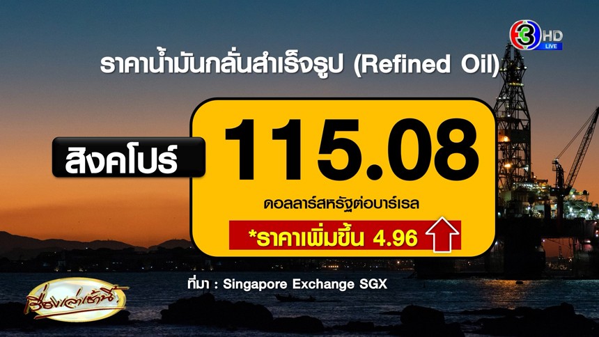 - น้ำมันกลั่นสำเร็จรูป สิงคโปร์ เพิ่มขึ้น 4.96 ดอลลาร์สหรัฐฯ/บาร์เรล ปิดที่ 115.08 ดอลลาร์สหรัฐฯ/บาร์เรล
