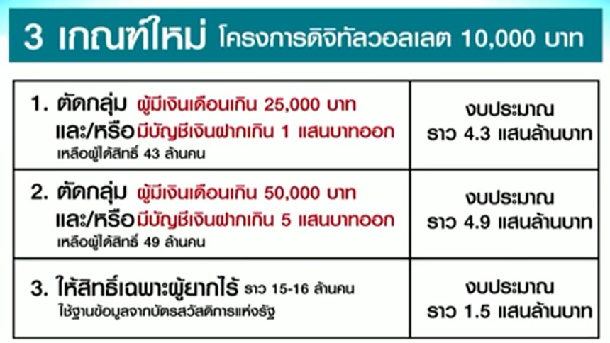 -ตัดกลุ่มผู้มีเงินเดือนถึง 25,000 บาท และ/หรือ มีบัญชีเงินฝากถึง 1 แสนบาทออก เหลือผู้ได้สิทธิ์ 43 ล้านคน ใช้งบประมาณราว 4.3 แสนล้านบาท