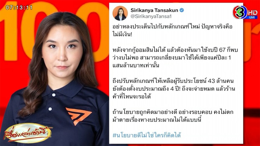 แท็กที่เกี่ยวข้อง ศิริกัญญา ตันสกุล ,แจกเงินดิจิทัล ,เงินดิจิทัลวอลเล็ต