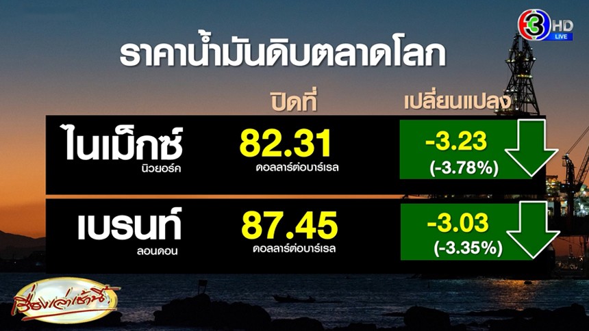 - ตลาดไนเม็กซ์ นิวยอร์ก ลดลง 3.23 ดอลลาร์สหรัฐฯ/บาร์เรล ปิดที่ 82.31 ดอลลาร์สหรัฐฯ/บาร์เรล