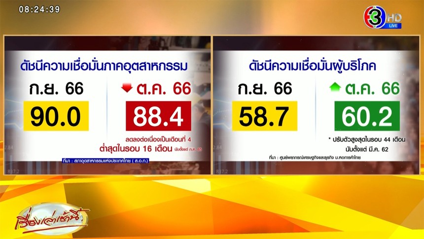 วันที่ 9 พฤศจิกายน นายธนวรรธน์ พลวิชัย ประธานที่ปรึกษาศูนย์พยากรณ์เศรษฐกิจและธุรกิจ มหาวิทยาลัยหอการค้าไทย เปิดเผยว่า จากการสำรวจตัวอย่างประชาชนทั่วประเทศจำนวน 2,245 คน พบว่า ดัชนีความเชื่อมั่นผู้บริโภคเดือน ตุลาคม 2566 อยู่ที่ระดับ 60.2 ปรับตัวดีขึ้นจากในเดือนกันยายน 2566 ที่ อยู่ระดับ 58.7 โดยเป็นการปรับตัวเพิ่มขึ้นต่อเนื่องเป็นเดือนที่ 3 และถือว่าดัชนีปรับตัวสูงสุดในรอบ 44 เดือน นับตั้งแต่เดือนมีนาคม 2562