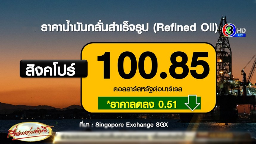 - น้ำมันกลั่นสำเร็จรูป สิงคโปร์ ลดลง 0.51 ดอลลาร์สหรัฐฯ/บาร์เรล ปิดที่ 100.85 ดอลลาร์สหรัฐฯ/บาร์เรล