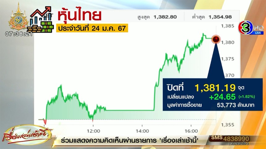หุ้นไทยวานนี้ ( 24 ม.ค.67) ปิดตลาดหุ้นบ่าย เพิ่มขึ้น 24.65 จุด ดัชนีอยู่ที่ 1,381.19 จุด มูลค่าการซื้อขาย 53,687.46 ล้านบาท