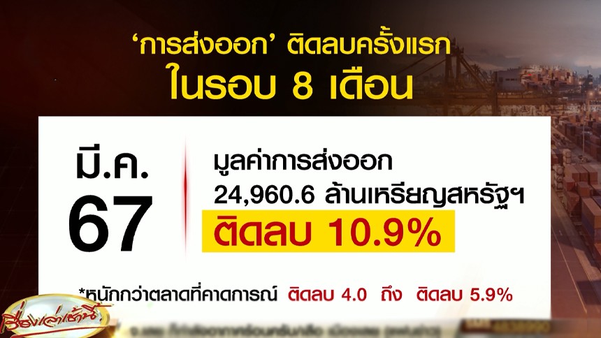 ส่งออก มี.ค.67 ติดลบ 10.9% ครั้งแรกในรอบ 8 เดือน ลุ้นผลไม้ช่วยชาติ ไตรมาส 2 พลิกเป็นบวก