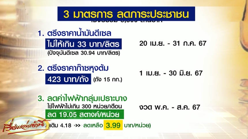 โดยมี 3 มาตรการหลัก คือ 1.เติมน้ำมันดีเซลให้ไม่เกิน 33 บาทต่อลิตร 2.ราคาปลีกของ LPG ที่ระดับ 423 ต่อถังขนาด 15 กิโลกรัม 3.ส่วนลดของค่าไฟ 19.05 สตางค์ต่อหน่วย ให้กับผู้ที่พักอาศัยอยู่บ้านพักใช้ไฟฟ้าไม่เกิน 300 หน่วย