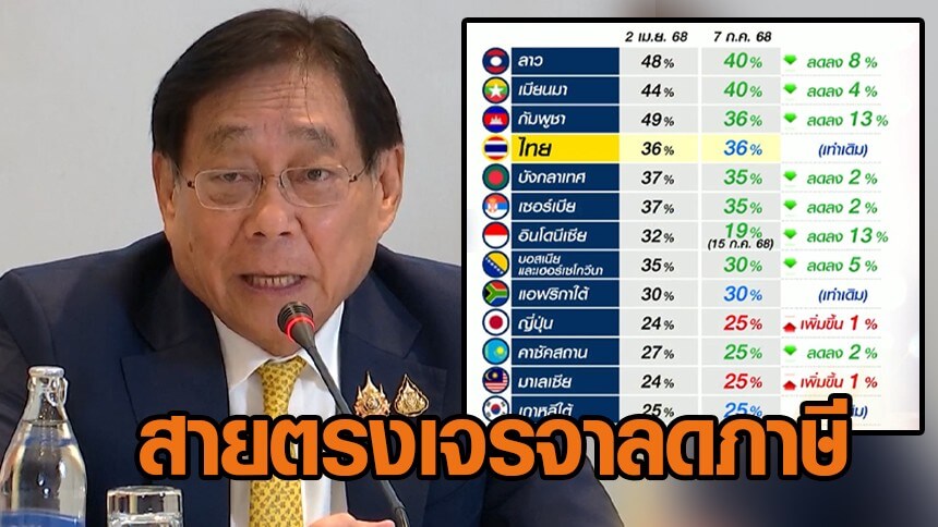 วานนี้ 17 ก.ค.2568 นายพิชัย ชุณหวชิร รัฐมนตรีว่าการกระทรวงการคลัง ในฐานะหัวหน้าทีมไทยแลนด์ สายตรงพูดคุยกับสำนักงานผู้แทนการค้าสหรัฐอเมริกา เพื่อชี้แจงรายละเอียดข้อเสนอใหม่ที่ไทยปรับปรุงไป ซึ่งมีการลดภาษีนำเข้าให้กับสหรัฐฯ หลายหมื่นรายการ ซึ่งผู้ส่งออก มั่นใจจะเจรจาสำเร็จ เพราะหากเปรียบเทียบกับอินโดนีเซีย หรือ เวียดนาม ที่ได้ดุลการค้าสหรัฐฯ มากกว่าไทยถึง 3 เท่า น่าจะเป็นข้อได้เปรียบการเจรจาของไทย