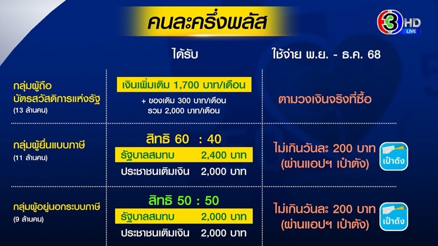 สรยุทธ อธิบายเงื่อนไข-สิทธิประโยชน์ คนละครึ่งพลัส ผู้เสียภาษีจะได้ 2,400 บาท กลุ่มประชาชนทั่วไปได้ 2,000 บาท โดยมีระยะเวลาการใช้ 2 เดือน ขณะที่ผู้ถือบัตรสวัสดิการแห่งรัฐ จะได้รับเพิ่มจาก 300 บาท เป็น 2,000 บาท ศิริกัญญา อัดใช้งบมหาศาล 6.6 หมื่นล้าน อาจเป็นการซื้อเสียงล่วงหน้า