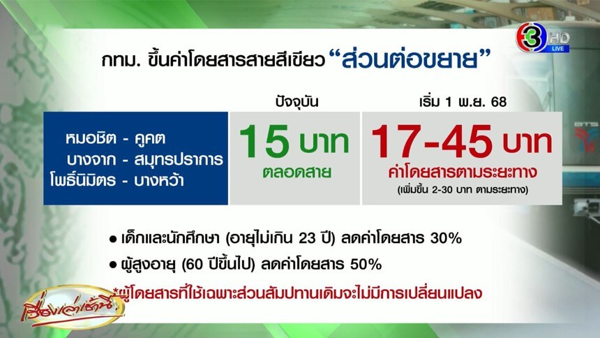 กทม.เตรียมขึ้นค่าโดยสาร บีทีเอสสายสีเขียว ส่วนต่อขยาย จากอัตราเดิม 15 บาทตลอดสาย เปลี่ยนเป็นคิดตามระยะทาง เริ่ม 17 บาท และเพิ่มขึ้นตามระยะทางไม่เกิน 45 บาท เริ่ม 1 พ.ย.นี้