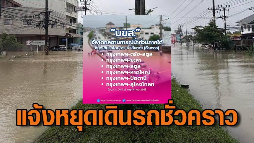 บขส. จำเป็นต้องหยุดเดินรถในเส้นทางดังกล่าวชั่วคราว ตั้งแต่วันนี้ (25 พฤศจิกายน 2568) เป็นต้นไป จนกว่าระดับน้ำจะลดลง เพื่อความปลอดภัย