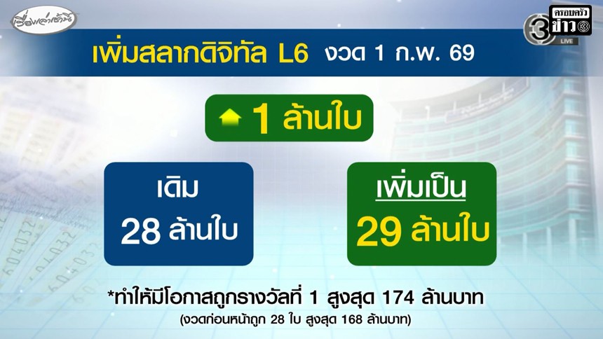 งวด 1 ก.พ.69 เพิ่มสลากดิจิทัลอีก 1 ล้านใบ เป็น 29 ล้านใบ ลุ้นถูกรางวัลที่ 1 สูงสุด 174 ล้าน