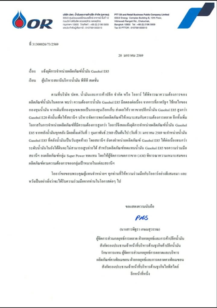 เมื่อวันที่ 21 ม.ค.2569 ผู้สื่อข่าวรายงานว่า บริษัท ปตท. น้ำมันและการค้าปลีก จำกัด หรือ โออาร์ ได้ขอแจ้งยุติการจำหน่ายผลิตภัณฑ์น้ำมัน Gasohol E85 จากทุกคลังน้ำมัน มีผล 1 กุมภาพันธ์ 2026 หลังพิจารณาความต้องการของผลิตภัณฑ์น้ำมันในตลาด พบว่า ความต้องการน้ำมัน GASOHOL E85 มีลดลงต่อเนื่อง ส่งผลให้ราคาขายปลีกน้ำมัน GASOHOL E85 สูงกว่า GASOHOL E20