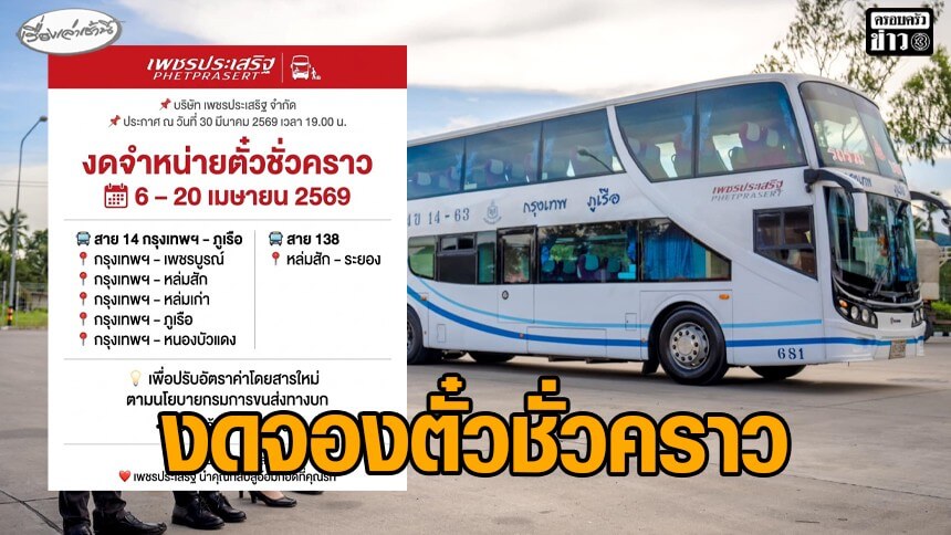 เมื่อวันที่ 30 มี.ค.2569 เพจบริษัท เพชรประเสริฐ จำกัด ผู้ให้บริการรถโดยสารประจำทางเพชรประเสริฐทัวร์ ประกาศ บริษัทฯ ขอแจ้ง ปิดปรับปรุงระบบจำหน่ายตั๋วโดยสารชั่วคราว สำหรับเส้นทางดังต่อไปนี้