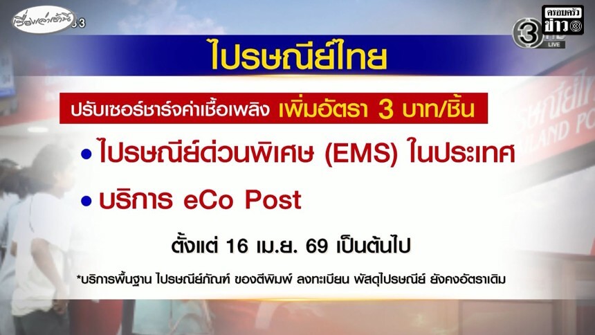 'ไปรษณีย์ไทย' ปรับเซอร์ชาร์จค่าเชื้อเพลิง เพิ่ม 3 บาทต่อชิ้น เริ่ม 16 เม.ย.