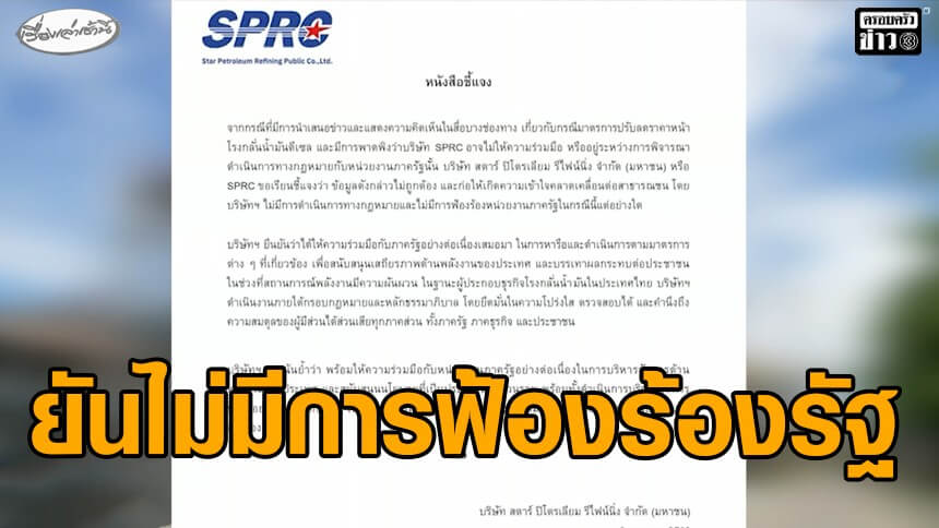 SPRC ร่อนหนังสือ ยันไม่มีการฟ้องร้องรัฐบาล ปมปรับลดราคาหน้าโรงกลั่น ย้ำให้ความร่วมมือภาครัฐเสมอ