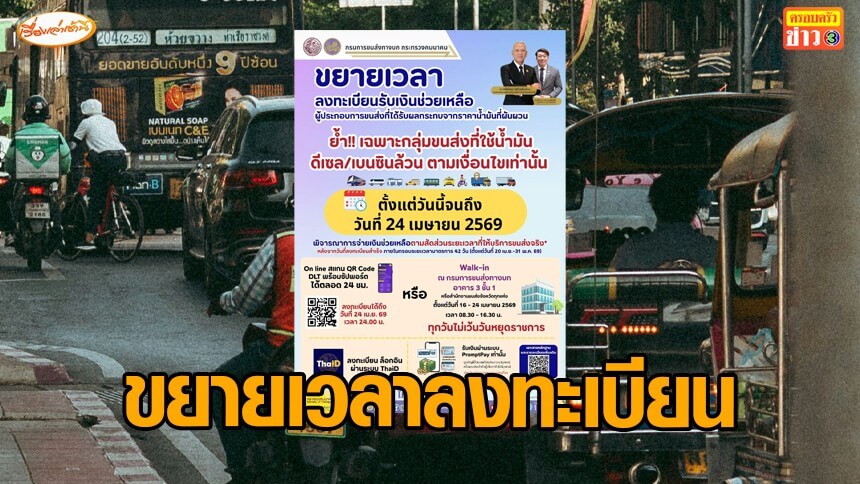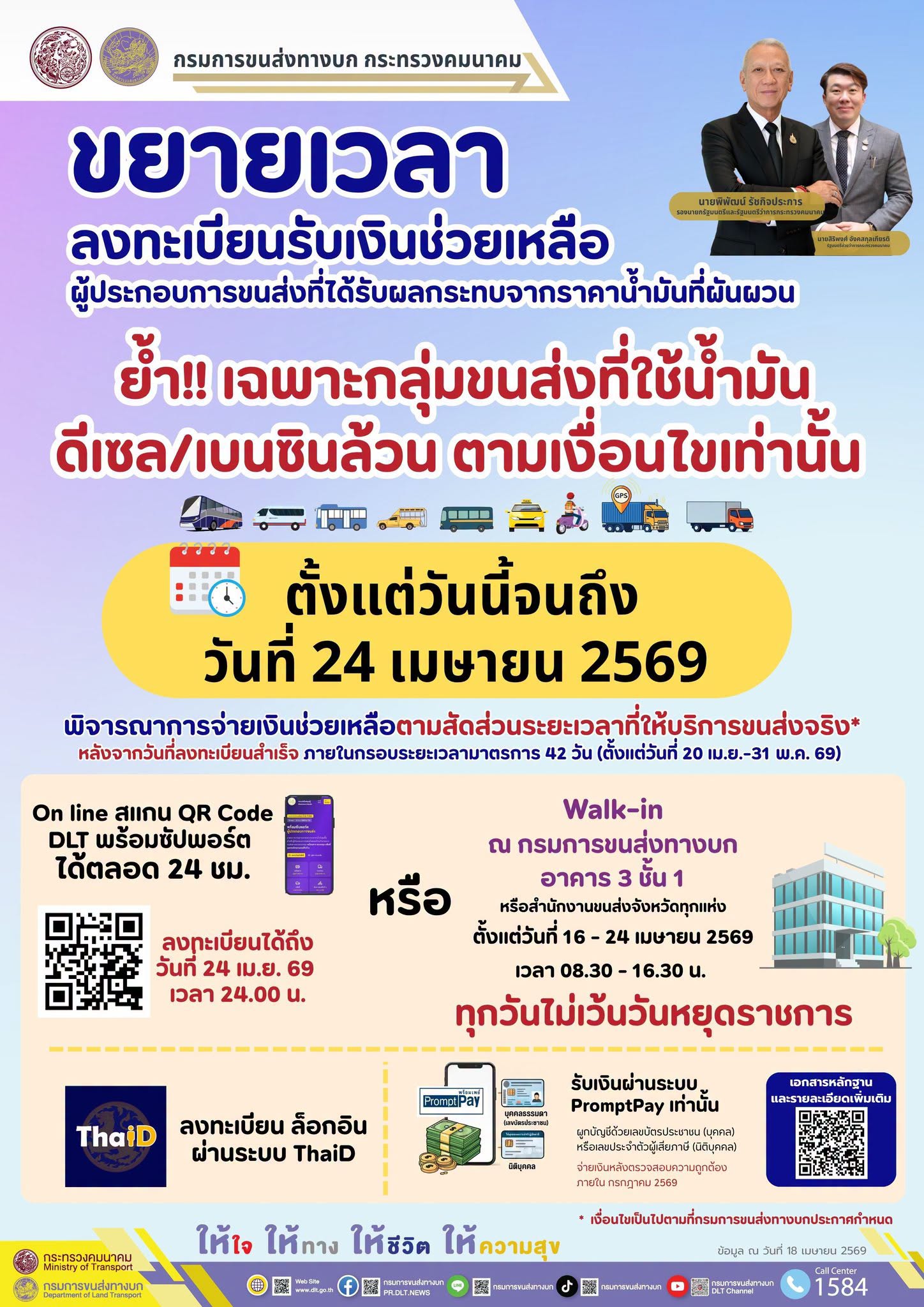 นายสรพงศ์ ไพฑูรย์พงษ์ อธิบดีกรมการขนส่งทางบก กล่าวว่า กรมการขนส่งทางบก ขานรับข้อสั่งการ รองนายกรัฐมนตรีและรัฐมนตรีว่าการกระทรวงคมนาคม และรัฐมนตรีช่วยว่าการกระทรวงคมนาคม โดยขยายเวลาลงทะเบียนรับเงินช่วยเหลือตั้งแต่วันนี้ไปจนถึงวันที่ 24 เมษายน 2569 (ไม่เว้นวันหยุดราชการ) สำหรับ “กลุ่มขนส่งที่ใช้น้ำมันเป็นเชื้อเพลิง” (น้ำมันดีเซลหรือเบนซินล้วน) ภายหลังที่เปิดรับลงทะเบียนมาแล้ว 2 วัน (16 – 17 เม.ย. 69) พบมีผู้ลงทะเบียนแล้วเป็นจำนวนมาก เป็นผู้ประกอบการที่มีสิทธิกว่า 26,000 ราย ในขณะที่จำนวนยานพาหนะที่ลงทะเบียนในระบบมีจำนวนรวมกว่า 116,000 คัน (ข้อมูล ณ วันที่ 17 เม.ย. 69) โดยผู้ประสงค์ขอรับสิทธิช่วยเหลือสามารถลงทะเบียนผ่านระบบ “DLT พร้อมซัปพอร์ต” ที่เว็บไซต์ https://tss.dlt.go.th/ ได้ตลอด 24 ชั่วโมง หรือมาดำเนินการลงทะเบียนขอรับสิทธิได้ ณ อาคาร 3 ชั้น 1 กรมการขนส่งทางบก หรือสำนักงานขนส่งจังหวัดทุกแห่งทั่วประเทศ