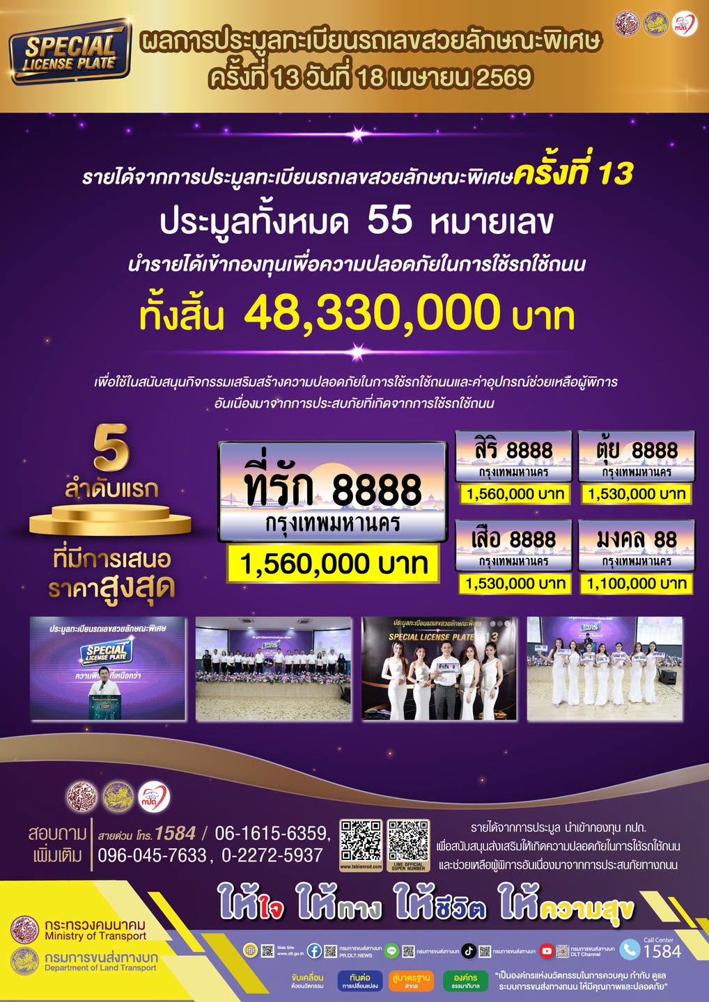 โดยการประมูลรอบนี้ มียอดเงินรายได้นำเข้ากองทุน กปถ. ถึง 48,330,000 บาท โดยผู้ชนะการประมูล จะได้ครอบครองป้ายทะเบียนรถลักษณะพิเศษ ซึ่งมีเอกลักษณ์ไม่ซ้ำใคร และได้ใช้ป้ายทะเบียนที่มีชื่อหรือความหมายตรงกับความต้องการของตัวเอง ซึ่งใช้เทคโนโลยีการพิมพ์แผ่นป้ายแตกต่างจากป้ายทะเบียนปกติ ตัวแผ่นป้ายไม่มีรอยดุนและไม่มีขอบ มีลวดลายกราฟิกและสามารถโอนเปลี่ยนแปลงกรรมสิทธิ์ให้ผู้อื่น หรือโอนเป็นมรดกได้