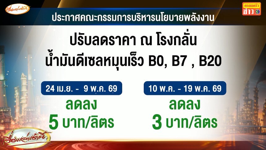 เมื่อวานนี้ (23 เม.ย.69) นายเอกนัฏ พร้อมพันธุ์ รัฐมนตรีว่าการกระทรวงพลังงาน เปิดเผยภายหลังการประชุมคณะกรรมการบริหารนโยบายพลังงาน (กบง.) ว่า ที่ประชุมได้มีมติเห็นชอบปรับลดราคา ณ โรงกลั่น สำหรับน้ำมันดีเซลหมุนเร็ว เพื่อบรรเทาผลกระทบด้านค่าครองชีพของประชาชน และดูแลเสถียรภาพราคาพลังงานของประเทศในช่วงภาวะวิกฤตพลังงาน โดยให้ยกเลิกประกาศ กบง. ลงวันที่ 8 เมษายน 2569 และกำหนดอัตราปรับลดราคา ณ โรงกลั่นใหม่สำหรับน้ำมันดีเซลหมุนเร็ว บี0 บี7 และบี20 เป็น 2 ช่วง ได้แก่ ช่วงวันที่ 24 เมษายน 2569 ถึงวันที่ 9 พฤษภาคม 2569 ปรับลด 5.00 บาทต่อลิตร และช่วงวันที่ 10 พฤษภาคม 2569 ถึงวันที่ 19 พฤษภาคม 2569 ปรับลด 3.00 บาทต่อลิตร