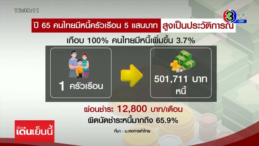 คนไทยแบกหนี้หลังแอ่น เฉลี่ย 5 แสนบาทต่อครัวเรือน หอการค้าไทย คาด หนี้ครัวเรือนปีนี้ พุ่ง 89% ต่อจีดีพี สูงสุดเป็นประวัติการณ์