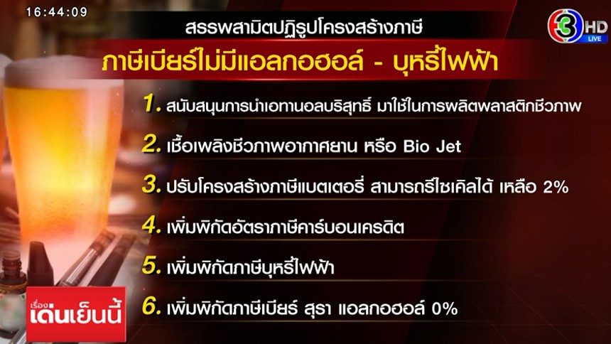 จากที่ปัจจุบันที่จัดเก็บอยู่ 8% / การเพิ่มพิกัดอัตราภาษีคาร์บอนเครดิต / การเพิ่มพิกัดภาษีบุหรี่ไฟฟ้า และการเพิ่มพิกัดภาษีเบียร์ สุรา แอลกอฮอล์ 0% ซึ่งปัจจุบันคนรุ่นใหม่หันไปบริโภคเบียร์ 0% กันมากขึ้น /กรมสรรพสามิต จึงเตรียมกำหนดพิกัดภาษีเครื่องดื่มแอลกอฮอล์ 0% ขึ้นมา