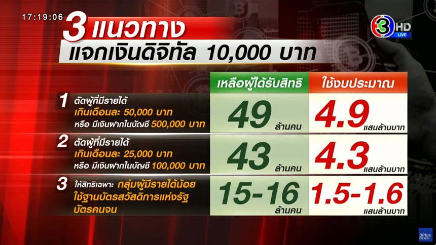 โดย ทางเลือกที่ 1 ตัดกลุ่มคนมีเงินเดือน 25,000 บาท หรือ มีบัญชีเงินฝากเกิน 1 แสนบาทออก ก็จะเหลือผู้มีสิทธิ 43 ล้านคน ใช้งบประมาณ 4.3 แสนล้านบาท