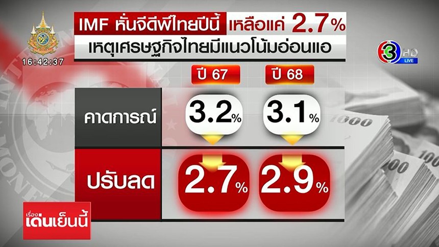 โดยในวันนี้ (30 เม.ย.) กองทุนการเงินระหว่างประเทศ หรือ IMF ได้ปรับลดคาดการณ์เศรษฐกิจไทยในปีนี้ ลงเหลือโตแค่ 2.7% ซึ่งลดลง 0.5% จากที่เคยคาดไว้จะโต 3.2% โดย IMF ให้เหตุผลว่า เศรษฐกิจไทยมีแนวโน้มอ่อนแอลง เนื่องจาก ความเป็นไปได้ที่จะใช้มาตรการกระตุ้นทางการคลังเลือนรางลง ซึ่งเท่ากับว่า IMF มองว่า ดิจิทัลวอลเล็ตอาจไม่ได้คลอด IMF ยัง ปรับลดคาดการณ์เศรษฐกิจไทยในปีหน้า (68) ลงเหลือ 2.9% ซึ่งลดลง 0.2% จากที่เคยคาดการณ์ไว้ก่อนหน้านี้