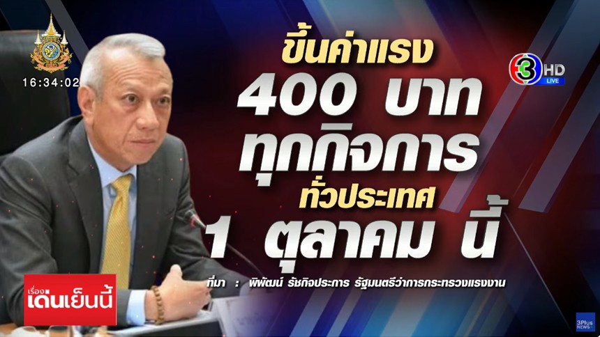 เช่นเดียวกับ นายพิพัฒน์ รัชกิจประการ รัฐมนตรีว่าการกระทรวงแรงงาน กล่าวว่า มติประกาศแจ้งปรับค่าแรงขั้นต่ำ 400 บาท เพื่อให้เท่าเทียมกันทั่วประเทศ ทุกจังหวัด ทุกอาชีพ ให้เริ่มในวันที่ 1 ตุลาคมนี้ ขณะที่แรงงานต้องปรับทักษะ เพื่อให้คุ้มทุนกับการปรับขึ้นค่าจ้างขั้นต่ำด้วยเช่นเดียวกัน พร้อมแสดงความเป็นห่วง กลุ่มผู้ประกอบการ SME ที่ได้รับผลกระทบจากภาวะเศรษฐกิจด้วย