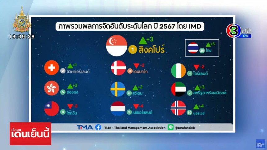 ท่ามกลางเรื่องวุ่นๆ ในประเทศ ก็มีเรื่องดีๆ สถาบันการจัดการนานาชาติหรือ IMD สวิตเซอร์แลนด์ เผยผลการจัดอันดับขีดความสามารถในการแข่งขันของประเทศ ประจำปี 67 พบว่า ไทยขยับอันดับมาอยู่ที่ 25 ของโลก และเเซงมาเลเซีย ขึ้นอันดับ 2 อาเซียน