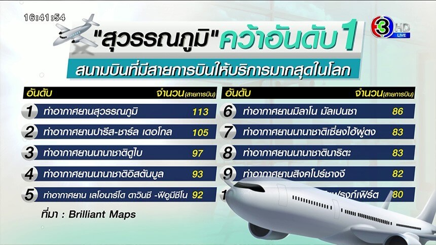 ท่าอากาศยานสุวรรณภูมิของไทย คว้าอันดับ 1 สนามบินที่มีสายการบินมากที่สุดในโลก มากถึง 113 สายการบิน ทิ้งห่างท่าอากาศยานปารีส ชาร์ล เดอโกลล์ ปารีส ที่ตกไปอยู่อันดับ 2 ขณะที่ท่าอากาศยานชางงีของสิงคโปร์ อยู่ในอันดับที่ 9