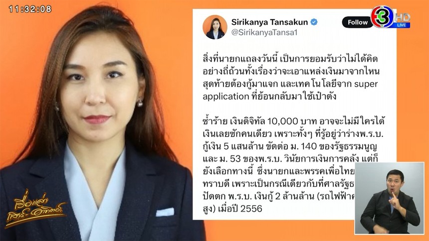 “รัฐบาลเองน่าจะเห็นแล้วว่าไม่มีทางที่จะไปได้จริงๆ ทางเลือกนี้เป็นการหาทางลงมากกว่าที่จะเดินหน้าโครงการนี้จริงๆ ถ้ากฤษฎีกาตีความเข้าข้างให้ผ่าน และส.ส. ในสภาก็ให้ผ่าน สิ่งที่จะเกิดขึ้นคือภาระหนี้ในแต่ละปีงบประมาณที่จะเพิ่มขึ้นปีละ 5 แสนล้านบาท หรือคิดเป็น 15% ของงบรายจ่ายประจำปี ซึ่งจะเป็นภาระงบประมาณอย่างใหญ่หลวง สิ่งที่รัฐบาลทำวันนี้จะทำภาระดอกเบี้ยเกิน 10% ในงบประมาณปี 68 ทันที ซึ่งเป็นเรื่องที่รัฐบาลไม่ได้พูดถึงทั้งเรื่องภาระหนี้ และภาระดอกเบี้ย ความเสี่ยงนี้จะไม่เกิดขึ้นหากพ.ร.บ.เงินกู้ 5 แสนล้านบาท ถูกทำแท้งตั้งแต่ต้นโดยกฤษฎีกา” น.ส.ศิริกัญญา กล่าว