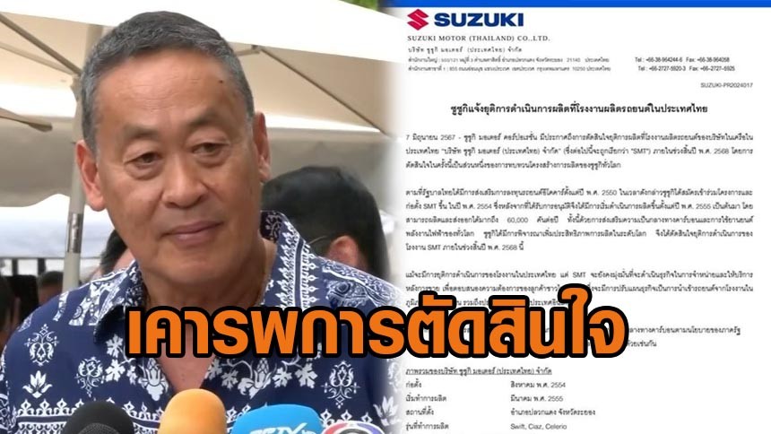 ล่าสุดวันนี้ 8 มิ.ย.67 นายเศรษฐา ทวีสิน นายกรัฐมนตรีให้สัมภาษณ์ถึงกรณีที่บ. ซูซูกิ มอเตอร์ คอร์ป ของญี่ปุ่นประกาศปิดตัวโรงงานผลิตรถยนต์ในประเทศไทย ภายในสิ้นปี 2568 ว่า ตั้งแต่ตนเข้ามาดำรงตำแหน่งเมื่อเดือนกันยายนปีที่ผ่านมา เรื่องการผลิตรถสันดาปที่มาจากประเทศญี่ปุ่นเป็นเรื่องที่เราให้ความสำคัญและเคยพูดมาหลายครั้งแล้วว่าเราได้มีการเจอกับผู้ผลิตรายใหญ่ไม่ว่าจะเป็นโตโยต้า ฮอนด้า อีซูซุ มาสด้า มิตซูบิชิ ว่าเขาอยากได้มาตรการอะไรจากเราบ้าง