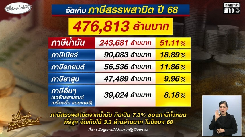โดยภาษีสรรพสามิตจากน้ำมันคิดเป็น 7.3% ของภาษีทั้งหมดที่รัฐบาลจัดเก็บได้ 3.3 ล้านล้านบาท ในปีงบประมาณ 2568