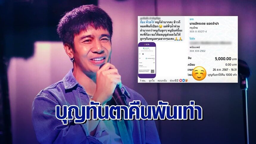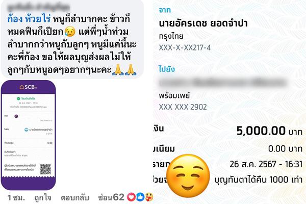 บุญทันตา สาวแม่ลูกอ่อนลำบาก แต่อยากช่วยทำบุญน้ำท่วม 5 บาท ‘ก้อง ห้วยไร่’ โอนคืนให้ 1,000 เท่า