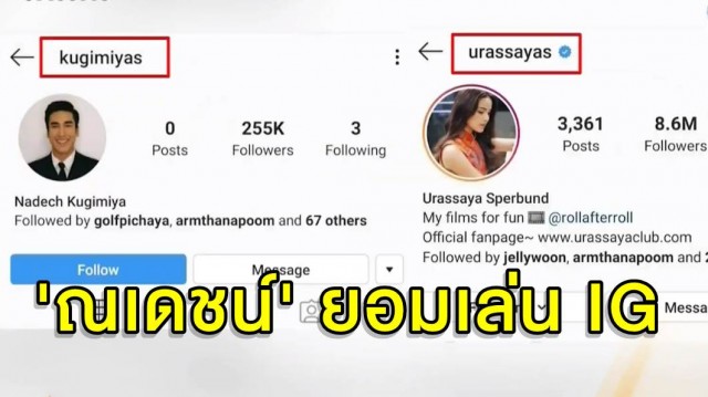 ความเคลื่อนไหวของ ณเดชน์ หรือคุณอชิระ มนุษย์ต่างดาวสุดหล่อจากละครลิขิตรักข้ามดวงดาว ที่ล่าสุดยอมเปิดอินสตาแกรมเป็นของตัวเองแล้ว โดยใช้ชื่อว่า Kugimiyas (คูกิมิยะ เติม S ด้วย) ซึ่งก็ไม่รู้บังเอิญหรือตั้งใจ เพราะตัวอักษร 3 ตัวสุดท้าย yas ช่างเหมือนกับ IG ของญาญ่าที่ใช้ชื่อว่า Urassayas แถมคนแรกที่ณเดชน์ติดตามก็คือ ญาญ่า ซะด้วย โดยแค่เปิด IG วันแรกก็มีคนกดติดตามแล้วหลายแสน