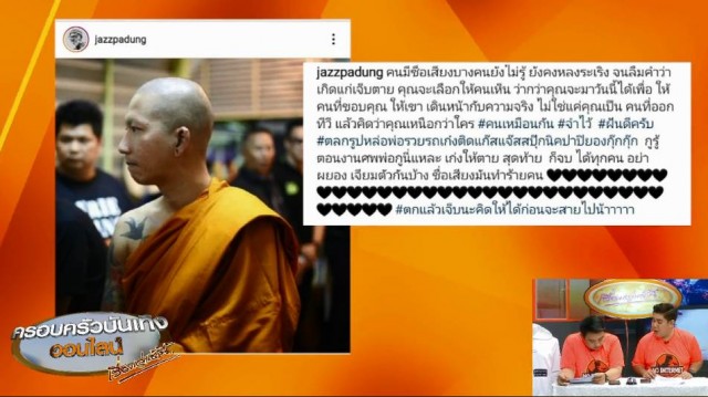 ขณะที่เพื่อนพ้องในวงการบันเทิงต่างเข้ามาแห่คอมเมนต์ ไม่ว่าจะเป็น ‘เปิ้ล นาคร’ ก็มาคอมเมนต์ว่า “หลวงพี่เดือด….!!!” ส่วน ‘ตุ๊กกี้ ชิงร้อย’ ก็เข้ามาให้กำลังใจบอกว่า “สู้นะแจ๊ส มองตาเรารู้ เราเหมือนกัน” ขณะที่ ‘หนูเล็ก ก่อนบ่าย’ ก็คอมเมนต์ว่า “มันกลายเป็นสันดานเค้าไปแล้วอ่าาาาาา”
