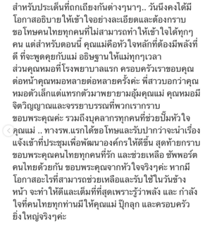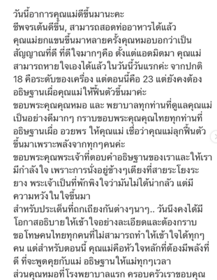 อาการยังอยู่ในภาวะที่เฝ้าสังเกตอาการ คุณหมอพยายามจะเข้าไปสู่ขั้นตอนการรักษา ซ่อมแซมเส้นเลือดในสมองค่ะ ถ้าคุณแม่ตอบสนองดี ไม่มีอะไรผิดปกติ ก็จะสามารถทำได้ อยู่ในสภาวะที่ทรง ๆ แต่ในความเชื่อคุณแม่จะผ่านได้แน่นอนค่ะ ขอพึ่งพลังการอธิษฐานในนามพระเยซูจากทุกคนนะคะ ยังไม่ได้นอนเลยตั้งแต่เมื่อวาน อดอาหารให้คุณแม่ด้วย ใครที่อธิษฐานเผื่อคุณแม่ ขอคุณงามความดี ส่งผลกลับไปถึงทุกคนนะคะ ตอนนี้คุณหมอยังไม่สามารถรับปากอะไรได้ อยู่ในภาวะที่ทุกอย่างเกิดขึ้นได้ ฝากอธิษฐานเผื่อนะคะ ขอบพระคุณทุกคอมเมนต์ ทุกคนที่เป็นห่วงมาก ๆ เลยค่ะ กราบขอบพระคุณคุณหมอยศ ที่รับเคสหนูยามดึก และโรงพยาบาลบำรุงราษฎร์ที่ดูแลเป็นอย่างดี อุ่นใจมาก ๆ ขอบพระคุณจริง ๆ จากหัวใจค่ะ”