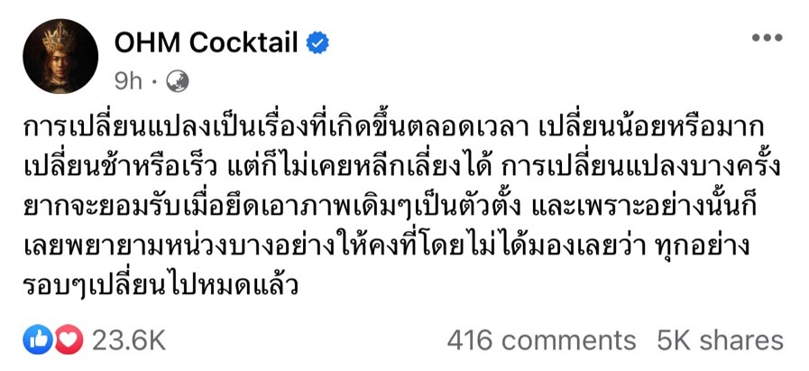 ขณะที่ ‘โอม วงคอกเทล’ ก็ได้โพสต์เฟซบุ๊กว่า “การเปลี่ยนแปลงเป็นเรื่องที่เกิดขึ้นตลอดเวลา เปลี่ยนน้อยหรือมาก เปลี่ยนช้าหรือเร็ว แต่ก็ไม่เคยหลีกเลี่ยงได้ การเปลี่ยนแปลงบางครั้งยากจะยอมรับเมื่อยึดเอาภาพเดิมๆ เป็นตัวตั้ง และเพราะอย่างนั้นก็เลยพยายามหน่วงบางอย่างให้คงที่โดยไม่ได้มองเลยว่า ทุกอย่างรอบๆ เปลี่ยนไปหมดแล้ว”