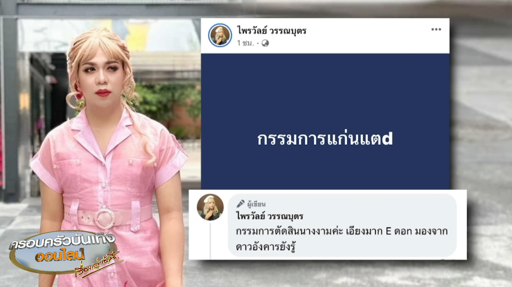 ขณะที่ 'แพรรี่ ไพรวัลย์' เองก็โพสต์เฟซบุ๊ก ระบุข้อความว่า "กรรมการแก่นแตd" แล้วคอมเม้นต์ต่อว่า "กรรมการตัดสินนางงามค่ะ เอียงมาก E ดอn มองจากดาวอังคารยังรู้"