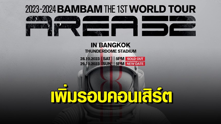 ศิลปินหนุ่มเกาหลีสายเลือดไทยอย่าง “แบมแบม กันต์พิมุกต์” หรือ “แบมแบม GOT7” ที่เตรียมมาจัดคอนเสิร์ตเวิลด์ทัวร์เดี่ยวครั้งแรกในเมืองไทยกับคอนเสิร์ต “2023-2024 BamBam THE 1ST WORLD TOUR [AREA 52] in BANGKOK” โดยจะมีขึ้นในวันที่ 28 ตุลาคม ที่สนามธันเดอร์โดม สเตเดียม