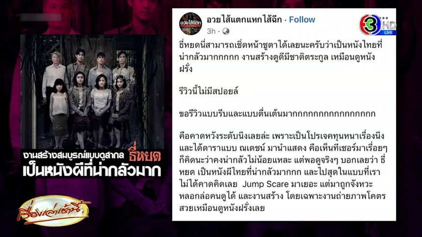 วานนี้ (24 ต.ค.66) เพจเฟซบุ๊ก 'อวยไส้แตกแหกไส้ฉีก' เพจที่นำเสนอเรื่องราวเกี่ยวกับภาพยนตร์ทั้งไทยและเทศ โพสต์ข้อความรีวิวภาพยนตร์เรื่อง 'ธี่หยด' ว่า งานสร้างดีระดับหนังผีฮอลลีวูด โดยระบุว่า