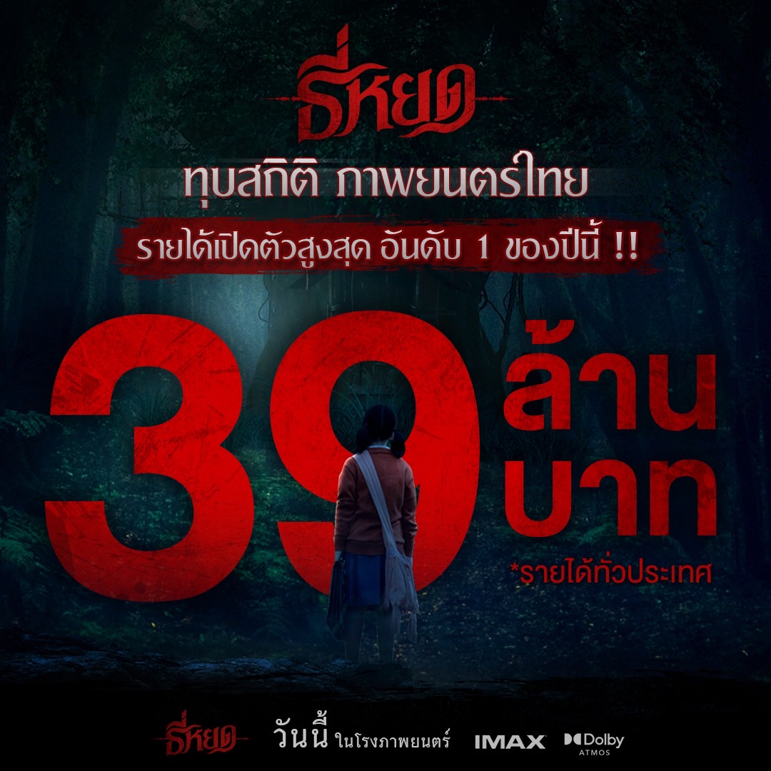 ภาพยนตร์หลอนระทึกขวัญ “ธี่หยด” ทุบสถิติภาพยนตร์ไทยรายได้เปิดตัวสูงสุด อันดับ 1 ของปีนี้ โกยรายได้ทั่วประเทศ 39 ล้านบาท
