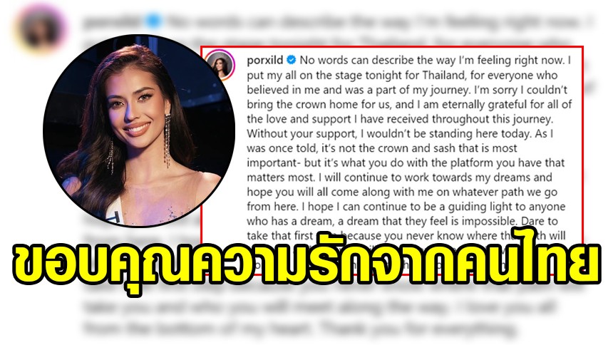 แปลเป็นไทยได้ว่า: “ไม่มีคำพูดใดสามารถอธิบายความรู้สึกของฉันตอนนี้ได้ ฉันได้ทำทุกอย่างบนเวทีคืนนี้เพื่อประเทศไทย เพื่อทุกคนที่เชื่อในตัวฉันและเป็นส่วนหนึ่งของการเดินทางของฉัน ฉันขอโทษที่ไม่สามารถนำมงกุฎกลับบ้านให้เราได้ และฉันจะรู้สึกขอบคุณตลอดไปสำหรับความรักและการสนับสนุนทั้งหมดที่ฉันได้รับตลอดการเดินทางครั้งนี้