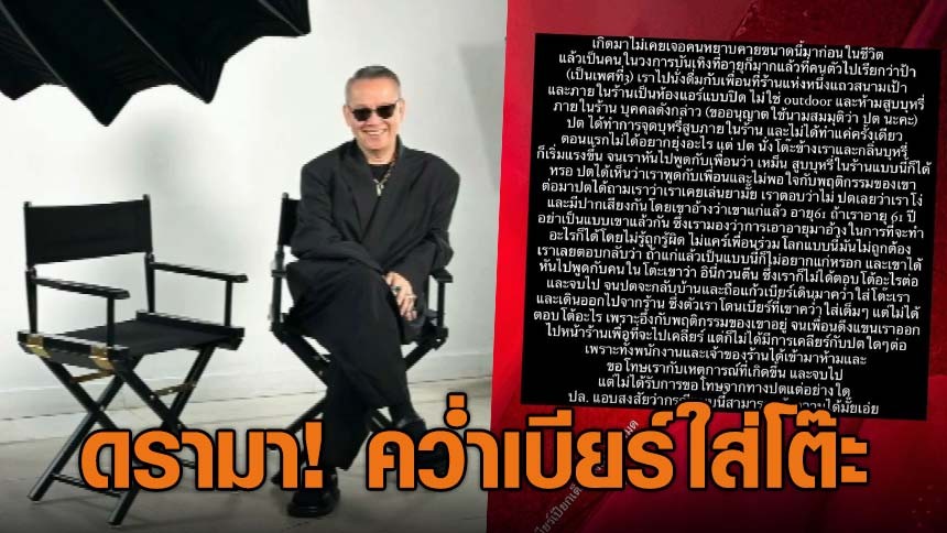 เรื่องราวที่ทางเพจโพสต์แฉมีอยู่ว่า “เกิดมาไม่เคยเจอคนหยาบคายขนาดนี้มาก่อนในชีวิต แล้วเป็นคนในวงการบันเทิงที่อายุก็มาก แล้วที่คนตัวไปเรียกว่าป้า (เป็นเพศที่ 3) เราไปนั่งดื่มกับเพื่อนที่ร้านแห่งหนึ่งแถวสนามเป้า และภายในร้านเป็นห้องแอร์แบบปิด ไม่ใช่ outdoor และห้ามสูบบุหรี่ภายในร้าน