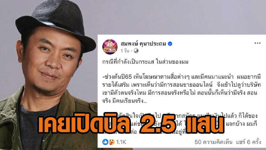 อี๊ด โปงลางสะออน โพสต์ชี้แจงผ่านเฟซบุ๊กส่วนตัวชื่อ สมพงษ์ คุนาประถม ระบุว่า “กรณีที่กำลังเป็นกระแส ในส่วนของผม ช่วงต้นปี 65 เห็นโฆษณาตามสื่อต่างๆ และมีคนมาแนะนำ ผมอยากมีรายได้เสริม เพราะเห็นว่ามีการสอนขายออนไลน์ จึงเข้าไปดูว่าบริษัทเขามีตัวตนจริงไหม มีการสอนจริงหรือไม่ ตอนนั้นก็เห็นว่ามีจริง สอนจริง มีคนเรียนจริง ผมจึงตัดสินใจเปิดบิลไป หลังจากสมัคร ผมเสียเงินไปแล้ว ก็ได้ของมาส่วนหนึ่ง แต่ของมันยังขายไม่ได้ ได้แต่ทานเองบ้าง แจกบ้าง ผมก็เลยไม่ได้ทำต่อ ตอนนี้ของก็ยังมีอยู่ที่บ้านครับ”