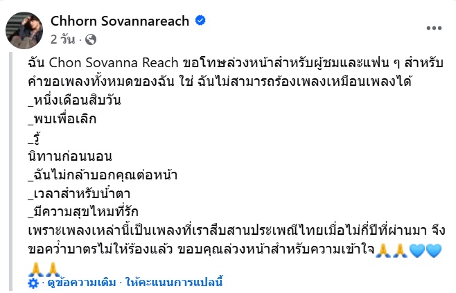 พร้อมบอกด้วยว่า ขอโทษล่วงหน้าสำหรับผู้ชมและแฟน ๆ สำหรับคำขอเพลงทั้งหมดของฉัน ใช่ ฉันไม่สามารถร้องเพลงเหมือนเพลงได้ เพราะเพลงเหล่านี้เป็นเพลงที่เราสืบสานประเพณีไทยเมื่อไม่กี่ปีที่ผ่านมา จึงขอคว่ำบาตร ไม่ร้องแล้ว ขอบคุณล่วงหน้าสำหรับความเข้าใจ