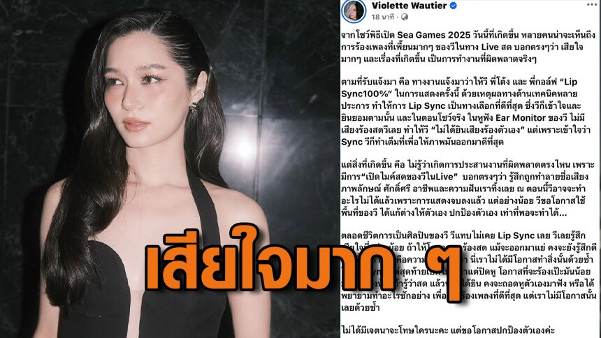 กลางดึกที่ผ่านมา “วี” วิโอเลต วอเทียร์ ได้ออกมาโพสต์ผ่านโซเชียล ระบุว่า จากโชว์พิธีเปิด Sea Games 2025 วันนี้ที่เกิดขึ้น หลายคนน่าจะเห็นถึงการร้องเพลงที่เพี๊ยนมากๆ ของวีในทาง Live สด บอกตรงๆว่า เสียใจมากๆ และเรื่องที่เกิดขึ้น เป็นการทำงานที่ผิดพลาดจริงๆ