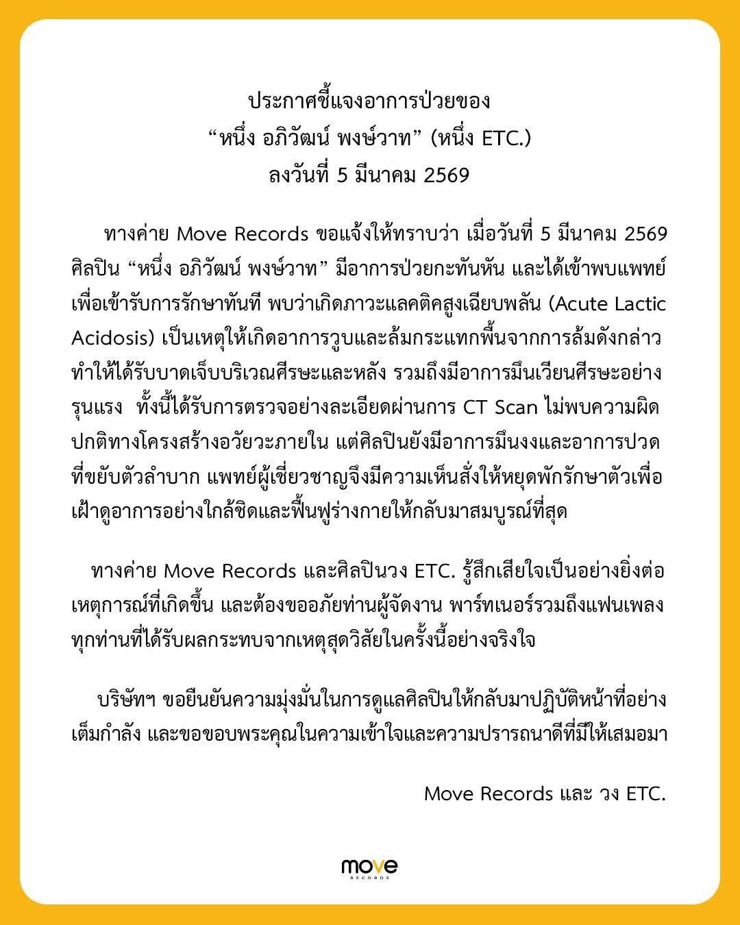 โดยข้อความในภาพเป็นประกาศชี้แจงอาการป่วยของหนึ่ง ETC. ระบุว่า ทางค่าย Move Records ขอแจ้งให้ทราบว่า เมื่อวันที่ 5 มี.ค. 2569 ศิลปิน “หนึ่ง ETC.” มีอาการป่วยกะทันหัน และได้เข้าพบแพทย์ เพื่อเข้ารับการรักษาทันที พบว่าเกิดภาวะแลคติคสูงเฉียบพลัน (Acute Lactic Acidosis) เป็นเหตุให้เกิดอาการวูบและล้มกระแทกพื้น จากการล้มดังกล่าว ทำให้ได้รับบาดเจ็บบริเวณศีรษะและหลัง รวมถึงมีอาการมึนเวียนศีรษะอย่าง รุนแรง ทั้งนี้ได้รับการตรวจอย่างละเอียดผ่านการ CT Scan ไม่พบความผิด ปกติทางโครงสร้างอวัยวะภายใน แต่ศิลปินยังมีอาการมึนงงและอาการปวด ที่ขยับตัวลำบาก แพทย์ผู้เชี่ยวชาญจึงมีความเห็นสั่งให้หยุดพักรักษาตัวเพื่อเฝ้าดูอาการอย่างใกล้ชิดและฟื้นฟูร่างกายให้กลับมาสมบูรณ์ที่สุด