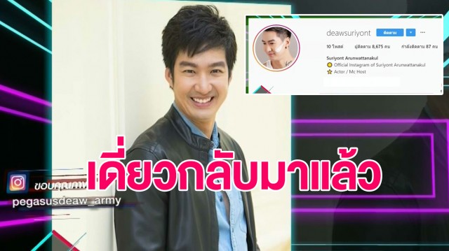 หลังจากที่นักแสดงและพิธีกรหนุ่มกล้ามโต เดี่ยว สุริยนต์ ได้ถูกแฮ็กอิสตราแกรมไปเมื่อต้นเดือนมกราคมที่ผ่านมา ซึ่งเจ้าตัวได้เข้าแจ้งความกับปอท.เรียบร้อยแล้ว แต่ไม่สามารถกู้ไอจีของเดิมกลับมาได้ จนล่าสุดเจ้าได้สร้างอิสตราแกรมใหม่โดยใช้ชื่อว่า Deawsuriyont มาให้แฟน ๆ ได้ติดตามกันเป็นที่เรียบร้อยแล้ว