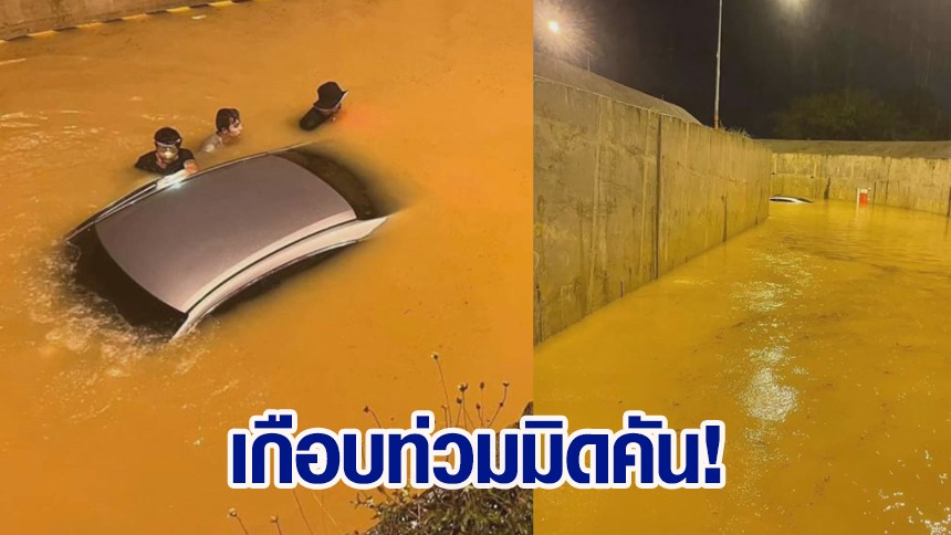 เกือบมิดคัน! ฝนตกน้ำท่วมอุโมงค์ทางลอดรถไฟโคราช หนุ่มไม่รู้ขับดิ่งลงน้ำ โชคดีเปิดประตูรถหนีได้ทัน