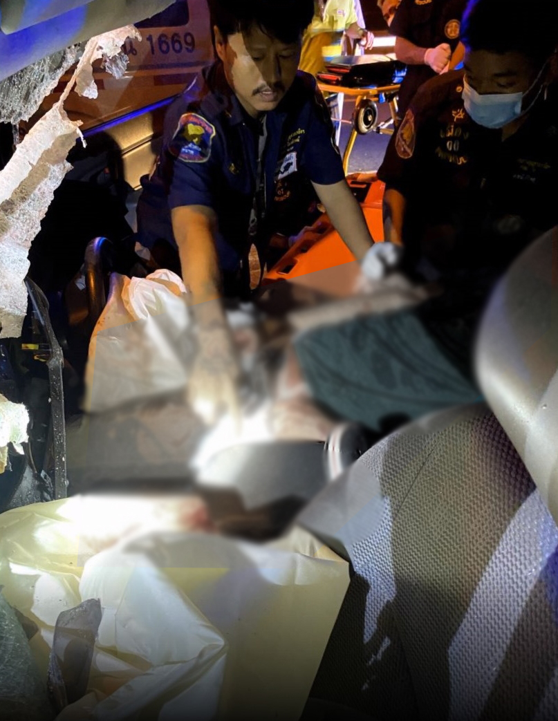 มาถึงที่เกิดเหตุพบรถยนต์กระบะ โตโยต้า วีโก้ สีขาว สภาพด้านหน้าพังเสียหายยับเยิน กระจกหน้าแตก คนขับเป็นชายติดอยู่ภายในห้องโดยสาร ทราบชื่อว่า นายจีรวัฒน์ กำเนิดสินธุ์ อายุ 17 ปี ได้รับบาดเจ็บ กะโหลกศีรษะและใบหน้าเป็นแผลฉกรรจ์ และถลอกตามร่างกาย เบื้องต้นเจ้าหน้าที่กู้ภัยเร่งช่วยเหลือผู้ได้รับบาดเจ็บออกมาจากตัวรถก่อนปฐมพยาบาลและนำตัวส่งรักษาที่โรงพยาบาลแหลมงอบ ห่างออกไปเล็กน้อยพบรถบรรทุกหกล้อ โตโยต้า หมายเลขทะเบียน 80-7640 ระยอง เสียหลักไถลขึ้นไปบนทางเดินเท้า สภาพท้ายรถเสียหายเล็กน้อย ทราบชื่อเจ้าของรถว่า นายบุญลือ ถาวรศาสตร์ อายุ 40 ปี