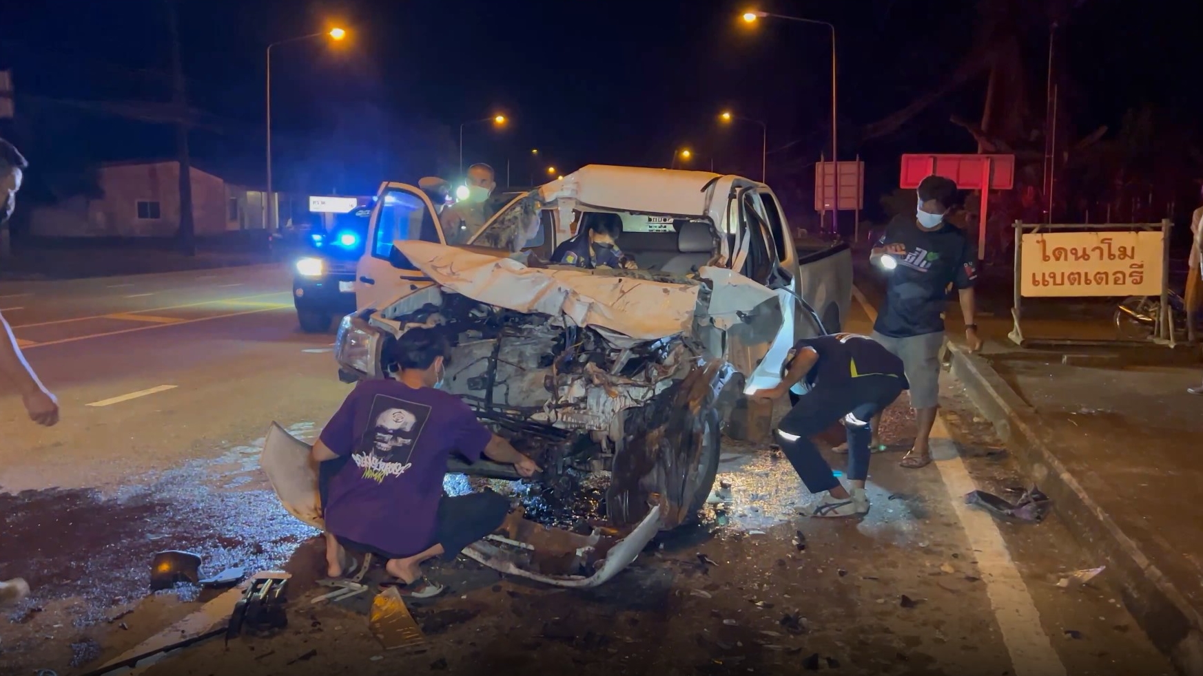 หนุ่ม 17 ขับกระบะ เสยท้ายหกล้อจอดเสียริมทางอย่างจัง เจ็บสาหัสคาซากรถ